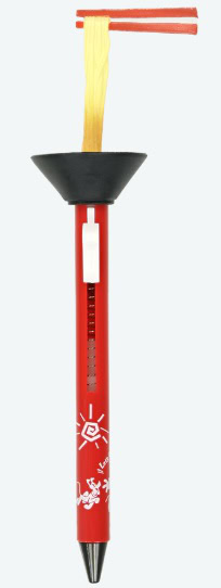 このボールペンの面白い点は、ノックすると箸と麺の部分が上下し、まるでラーメンを食べているかのように見えるギミックです。