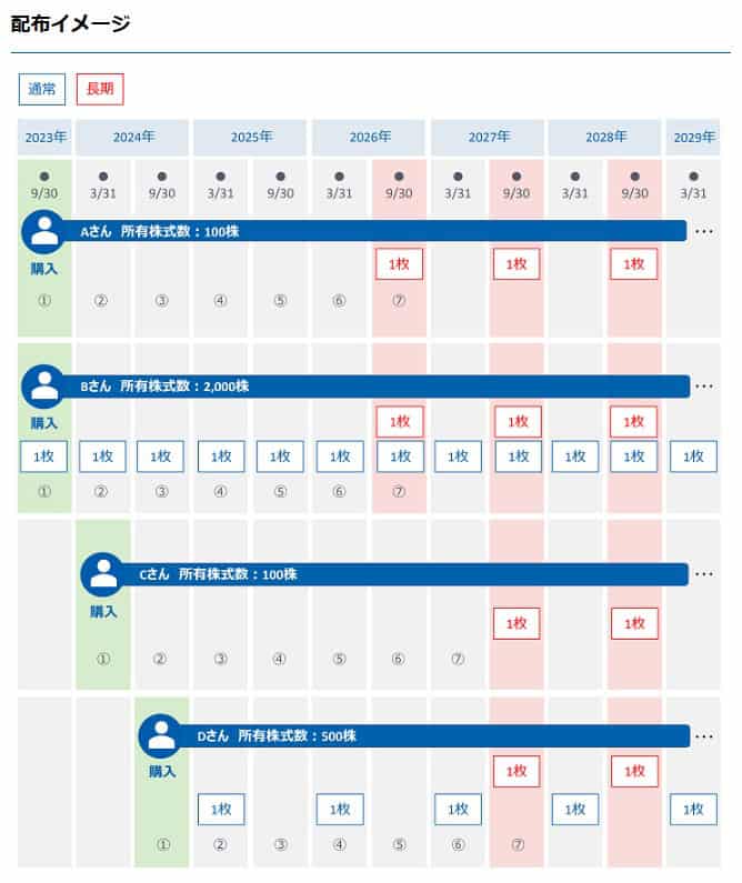 現在の株主優待制度では、「最低何株から」もらえるかは、保有期間によって異なります。